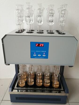 • COD消解裝置(KHCOD-12型)——國家標準GB11914-89—COD標準回流儀 COD消解裝置(COD標準回流儀)遵循了國家GB 11914-89標準分析方法,嚴格地規定了加熱消解時間,保證了回流加熱微沸2小時的消解操作,分析結果可靠精確。 COD消解裝置(COD標準回流儀)主要由機身、回流管、風扇、電爐罩等4大部分組成,COD消解裝置采用微機技術進行定時控制加熱電爐板和風扇,可對6個、8個、12個回流裝置同時進行加熱。 KHCOD型COD消解裝置(COD標準回流儀)采用玻璃毛刺回流管代替球形回流管,并以風冷加水冷技術取代自來水冷卻方式。冷卻部分主要由毛刺冷凝管和雙風機完成,加上上部分球形回流管內冷卻水和機內風機的雙重作用,確保了樣品的回流冷卻。 KHCOD型COD消解裝置技術參數 測量范圍:5~800mg/L,800~10000mg/L (經稀釋) 樣品數量:12個 ( 有6個、8個、12個三種 ) 測量時間:不大于2小時 測量誤差:鄰苯二甲酸氫鉀標準溶液(500mg/L),相對標準偏不大于5.0% 工業有機廢水(500mg/L),相對標準偏不大于8.0% 環境溫度:0~45℃ 準 確 度:COD與經典回流法比對,結果相同 加熱功率:1500W 平均功率:600W 外型尺寸:40*28*62(不計冷凝管高度)