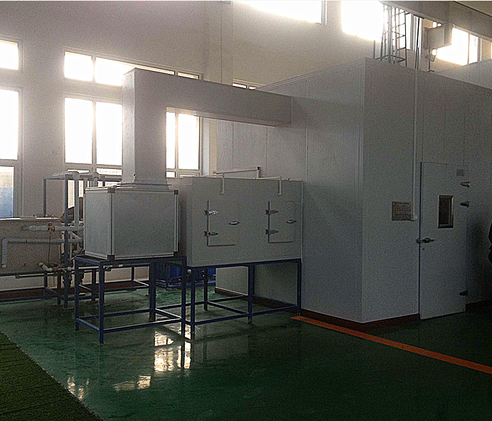 • 【產品概述】 本試驗室是風機盤管機組的熱工性能試驗室,可以準確測定風機盤管機組冷量,熱量、風量技術數據。同時還可以用于其他標準工況相關試驗及擴展試驗,為客戶提供了一套完整的試驗手段,滿足產品抽檢及產品開發(匹配)使用。 本試驗室由一間工況室組合而成,滿足風機盤管空調器試驗室環境氣候工況需要。室內設有風量測量裝置,滿足風機盤管空調器風量的測量需要。試驗室的冷熱水處理和流量溫度測量系統滿足了風機盤管機組熱工性能試驗的需要。 【執行標準】 GB/T19232-2003《風機盤管機組》 【測試項目】 1. 風量試驗 2. 功率 3. 供冷量試驗 4. 供熱量試驗 【技術參數】 1.測試方法:空氣側焓差法、水側流量計法。 2.風量測試范圍:300~2400m3/h 3.供冷量、供熱量測試范圍(在上述風量范圍內): 供冷量1800~12600W;供熱量2700~20000W; 4.控制環境溫、濕度范圍 水溫 范圍 制冷工況 進水溫度 ℃ 6.0~9.0±0.3 制熱工況 進水溫度 ℃ 60.0±0.3 空氣 溫度 制冷工況 進風干球溫度 ℃ 25.0~29.0±0.5 進風濕球溫度 ℃ 17.0~21.0±0.3 制熱工況 進風干球溫度 ℃ 21.0±0.5 設備出口余壓調節范圍 Pa 0~100±2.0 5.適用被試機規格 1)試驗機種:風機盤管機組; 2)體 積:機體小于 寬2200×長1000×高1500 mm; 3)被測機電源:AC220V 2kW。 【結構與配置】 1.室內占地:長10×寬8×高5 m ; 2.地面:室內為水平堅實地面,負荷能力大于0.3T/m2; 3.圍護結構材料:100mm厚聚苯彩鋼板 圍護結構門:1扇; 4.電源:AC380V 80kW; 5.圍護結構照明: 熒光燈 40W×4(AC220V); 6.供水:清潔自來水至試驗室,試驗室要求有地漏。 聯系電話:010-68325410