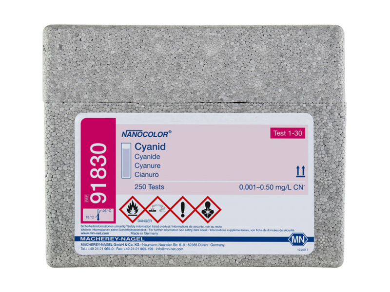 • NANOCOLOR?標(biāo)準(zhǔn)測(cè)試試劑 氰化物標(biāo)準(zhǔn)測(cè)試試劑 ( Cyanide ) 91830 氰化物標(biāo)準(zhǔn)測(cè)試試劑,高靈敏性光度測(cè)定法,單次測(cè)量成本低。 測(cè)量參數(shù): 氰化物 測(cè)量范圍: 0.001–0.50 mg/L CN? 測(cè)試編號(hào): 1-30 符合:APHA 4500-CN- E, DIN 38405–D13-1標(biāo)準(zhǔn) 方法: babituo 酸/吡啶法 適用于: 500 D, UV/VIS II, VIS II 海水分析: 適用 保質(zhì)期: 1年 儲(chǔ)存溫度:15?25℃ 可測(cè)次數(shù): 250 次/盒 有害物質(zhì):是