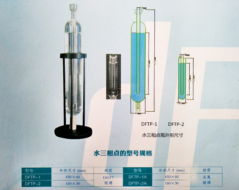 • 水三相點瓶 DFTP-1 DFTP-2 二種水三相點瓶外形尺寸 水三相點是國際實用溫標中一個極為重要的定義固定點,它也是用來定義熱力學溫度單位-開爾文的基準點。水三相點是能最準確復現的固定點。90國際溫標(International Temperature Scale of 1990,簡稱 ITS-90)中定義水三相點溫度值為273.16K(0.01℃)。同時在ITS-90國際溫標中,從13.8033K~961.78℃溫區中的內插公式都表示為W(T)=R(T)/Rtp。式中Rtp為標準鉑電阻溫度計在水三相點(0.01℃)的電阻值。因此水三相點的正確復現、準確測量,是標準鉑電阻準確測溫的關鍵。其復現精度Rtp≤4.0 mK。 水三相點瓶的型號規格 型號 外形尺寸(mm) 材質 型號 外形尺寸(mm) 材質 DFTP-1 450×60 GG17 玻璃 DFTP-1A 450×60 石英 玻璃 DFTP-2 160×30 DFTP-2A 160×30