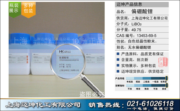 • 中文名稱:偏硼酸鋰 英文名稱:Lithium metaborate 別 名:無水偏硼酸鋰,偏硼酸鋰,無水。 CAS NO:13453-69-5 分 子 式:LiBO2 分 子 量:49.75 規(guī) 格:高純 99.5% 包 裝:多種包裝 產(chǎn)品性狀: 白色結(jié)晶性粉末。 本品選用優(yōu)等原料制成,屬于優(yōu)等品質(zhì)。 主要用途: 1)偏硼酸鋰用于X射線熒光分析助溶劑,廣泛用于水泥廠,鋼鐵廠分析用。推薦和無水四硼酸鋰混合熔融氧化鋁、氧化硅、五氧化二磷、硫化物等試樣;本公司同時供應(yīng)無水四硼酸鋰和無水偏硼酸鋰高純混合硼酸鹽熔劑; 2)偏硼酸鋰用作生產(chǎn)鋰基潤滑脂的添加劑; 3)偏硼酸鋰用作玻璃或陶瓷生產(chǎn)行業(yè)的熔劑; 4)偏硼酸鋰用于新材料開發(fā)。 價 格:以當(dāng)天報價為準(zhǔn)(歡迎來電查詢)