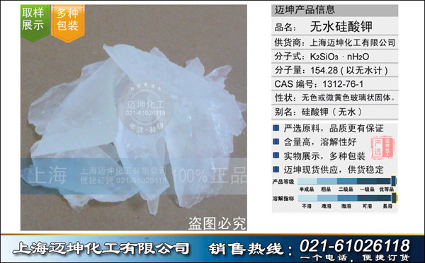 • 中文名稱:無水硅酸鉀 英文名稱:Potassium silicate 別 名:鉀水玻璃,硅酸鉀,無水,矽酸鉀,高純硅酸鉀,固體硅酸鉀。 CAS NO:1312-76-1 分 子 式:K2SiO3 分 子 量:154.28 規 格:優等品/高純 包 裝:多種包裝 產品性狀: 本品選用優等原料制成,屬于優等品質。 本品為無色或微黃色半透明至透明玻璃狀物(玻璃狀固體)。 有吸濕性。溶于水,不溶于乙醇。 主要用途: 1)高純無水硅酸鉀用作洗滌劑,清洗硅片用; 2)高純無水硅酸鉀用作催化劑; 3)高純無水硅酸鉀用作填料劑; 4)高純無水硅酸鉀用于保護涂層(防止“起霜”即鹽表面結晶); 5)高純無水硅酸鉀用于磷光體膠粘于顯象管上,涂電焊棒外面,可以克服濺散; 6)無水硅酸鉀在制造玻璃、陶瓷中用作洗滌去垢劑; 7)無水硅酸鉀可用作熒光屏的粘合劑; 8)無水硅酸鉀可用作制造熒光粉和導電石墨乳的輔助材料; 9)無水硅酸鉀可用于電焊條、焊接用電極的制造; 10)無水硅酸鉀可用于還原染料、防火劑的制造; 11)無水硅酸鉀可用于新材料開發。 價格:以當天報價為準(歡迎來電查詢)
