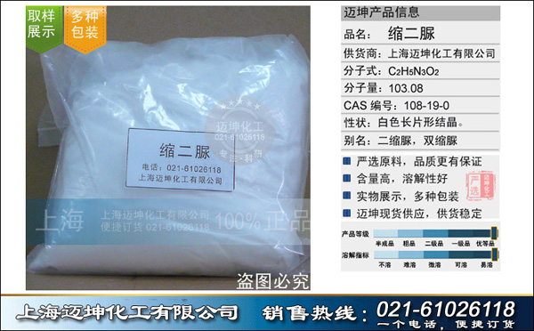 • 中文名稱:縮二脲 英文名稱:Biuret 別 名:二縮脲,貳縮脲,雙縮脲,氨基甲酰脲,氨縮脲,亞氨基二碳酸二酰胺 。 CAS NO:108-19-0 分 子 式:C2H5N3O2 分 子 量:103.08 規 格:工業級/優等品/分析純 包 裝:多種包裝 產品性狀: 本品選用優等原料制成,屬于優等品質。 本品為白色長片形結晶。無氣味。有吸濕性。 水中結晶者含4分子結晶水。約110℃時失水,193℃時分解,溫度再高時成三聚氰胺。易溶于乙醇,微溶于乙醚。 水中溶解度隨溫度升高而增加,(g/100g):25℃時2.01,50℃時7.0,75℃時20,105.5℃時53.5。 水溶液與硫酸銅和氫氧化鈉反應時呈淺紫色。 密度:1.467熔點:190℃ 主要用途: 1)分析純縮二脲用于分析化學,測定銅、蛋白質; 2)縮二脲可用作中間體、生長激素; 3)縮二脲可用作發泡劑、制漆; 4)工業級縮二脲可用于用于反芻動物飼料中,與尿素作為飼料添加劑一樣,但比尿素安全; 5)縮二脲可用于新材料開發。 價 格:以當天報價為準(歡迎來電查詢)