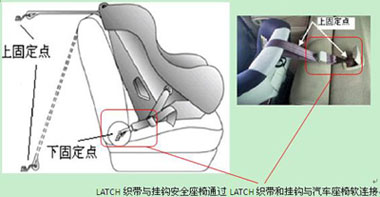 依照法規FMVSS213,所有汽車后座位置都要安裝有兒童安全座椅固定點,位于汽車座椅靠背和坐墊之間。兒童安全座椅底部有連接件,可以是剛性的或可變形的,用來連接汽車座椅較低位置的固定點。另外,汽車座椅要有上部固定點,連接兒童座椅的上拉帶。較低位置的固定點和上拉帶就組成了LATCH系統。